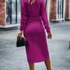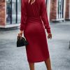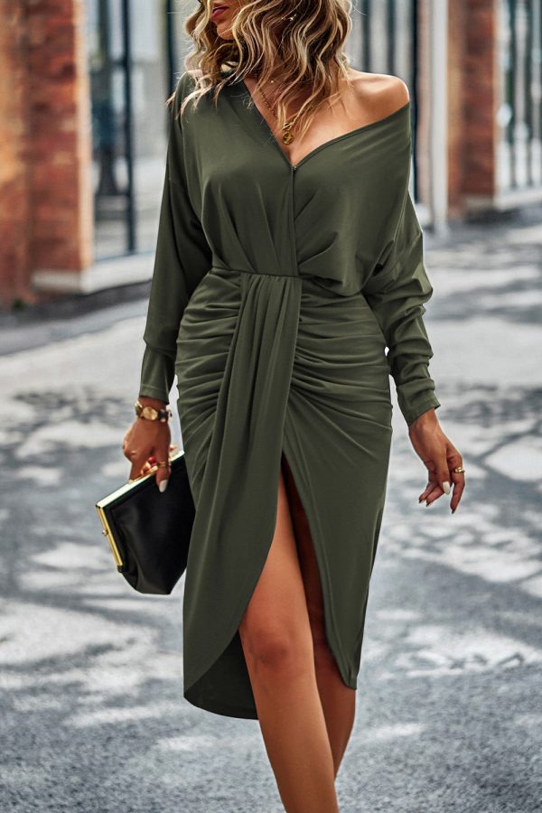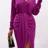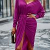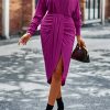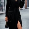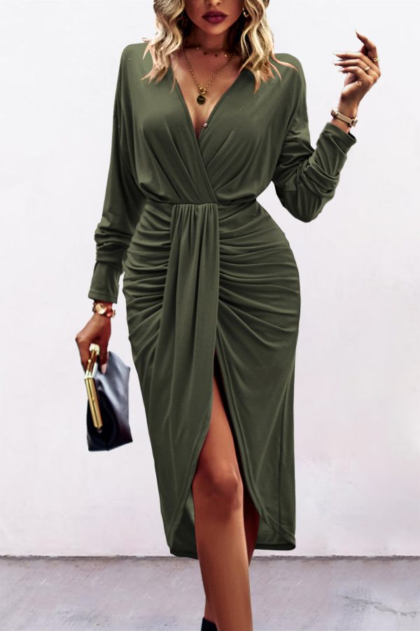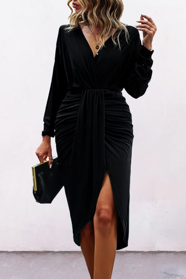 Women’s Ruched Wrap V Neck Split Hem Draped Front Bodycon Dresses